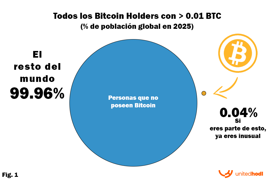 Muchos creen que la adopción de Bitcoin ya está masificada, pero la realidad es otra. De los 8 mil millones de personas en el mundo, más del 99.96% no tienen ni siquiera 0.01 Bitcoin.